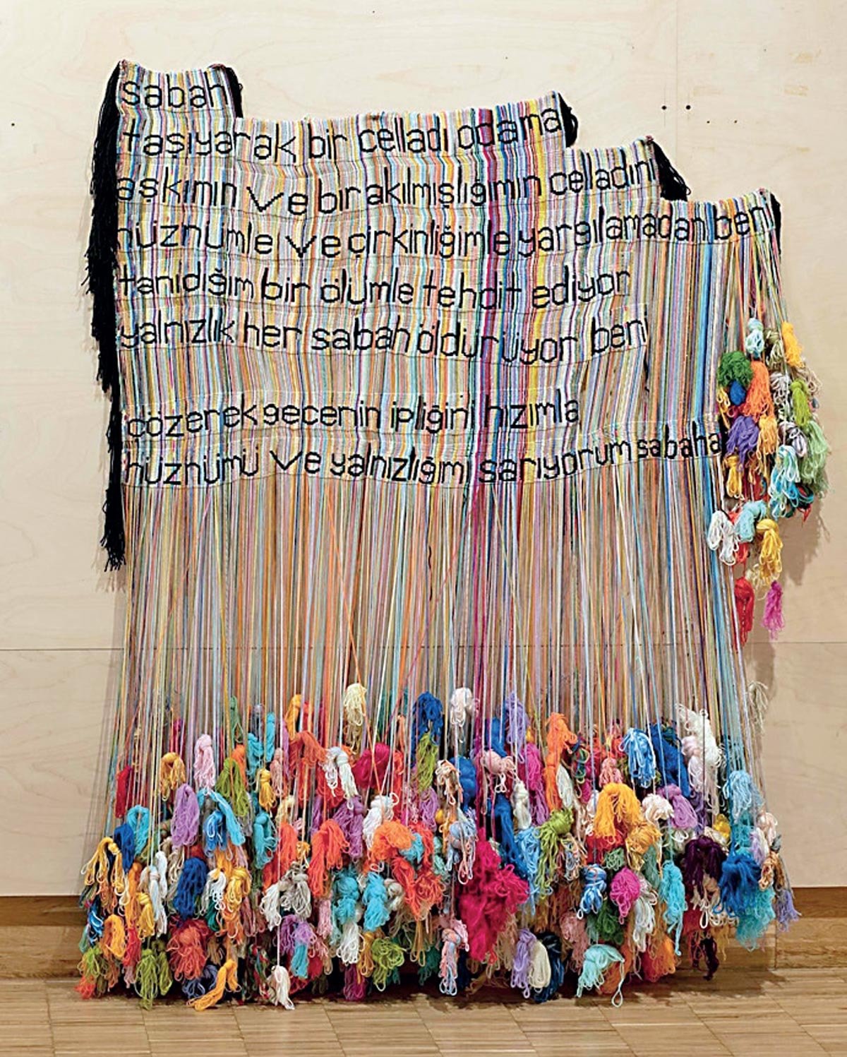 Özellikle 1992 yılında akademisyen ve sanatçı Gülçin Aksoy’un atölyeye asistan olarak katılmasıyla birlikte Halı Atölyesi, hem MSGSÜ içinde hem de sanat çevrelerinde giderek daha fazla tanınıyor… Aksoy’un “Bir halıyı da dokuyabilirsiniz, bir fikri de” sözü, dokumanın salt teknik bir uğraş değil, toplumsal meseleleri dile getiren bir ifade biçimi olabileceğini gösteriyor. Sergide, gazete küpürleri, yarım kalmış dokumalar, şiir dizelerinin atkılara işlendiği işler ya da pankartı andıran halılar bunun örnekleri olarak öne çıkıyor.