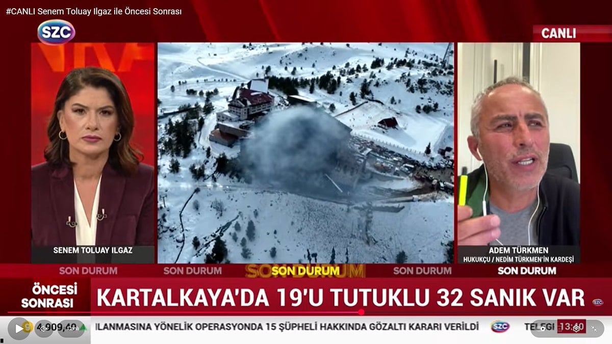 Türkiye’yi derinden yaralayan 36’sı çocuk 78 kişinin yaşamını yitirdiği Bolu Kartalkaya’daki Grand Kartal Otel faciasının ikinci duruşması 22 Eylül’de Bolu Sosyal Bilimler Lisesi’nde görülecek. Faciada eşi ve iki çocuğuyla yaşamını yitiren yazarımız Nedim Türkmen’in yakınları da adalet bekliyor. Türkmen’in hukukçu olan kardeşi avukat Adem Türkmen, SÖZCÜ TV’de Senem Tolunay’ın sunduğu ‘Öncesi Sonrası’ programına katıldı. Türkmen, Grand Kartal Otel Faciası davasını eleştirdi.